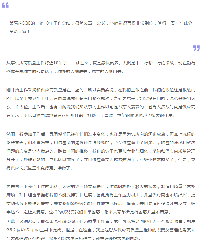 从事供应商多年的某高企SQE分享了一篇10年的工作总结,一起来看看吧!